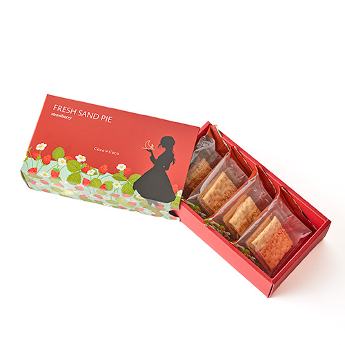 Coco≠Cocoのお菓子の中で唯一ホワイトチョコレートを使用したサンドパイ。フリーズドライのいちごの酸味がホワイトチョコの甘みを一層引き立てます。